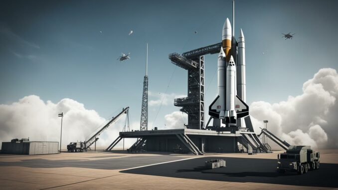 Die Abbildung zeigt eine Raketenabschussrampe in Aktion und verdeutlicht die Bedeutung des Begriffs.